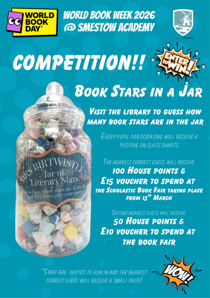 Pupils can also win £15 or £10 vouchers to spend at the book fair by entering the World Book Day competition in the library, Book Stars in a Jar, simply guess how many book stars are in the jar, the nearest guesses will win the vouchers and every pupil entering the competition will earn house points, competition ends at 3pm Friday 6th March!